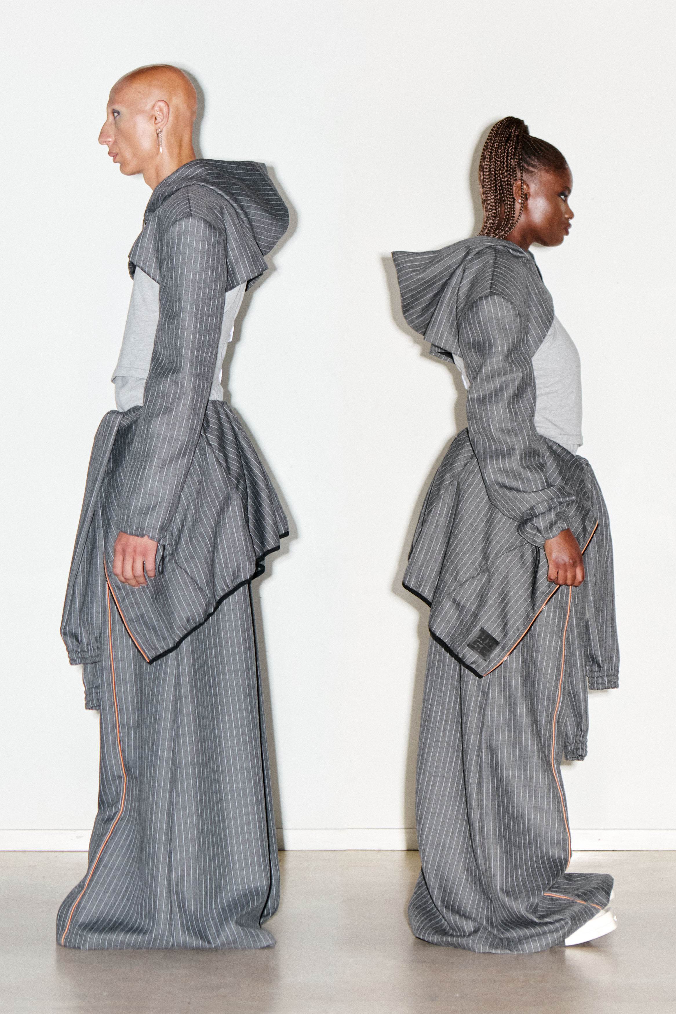 This garment is made in 100% wool and lining in 100% acetate from deadstock. This garment has wide shoulders with shoulderpads and a big hood.