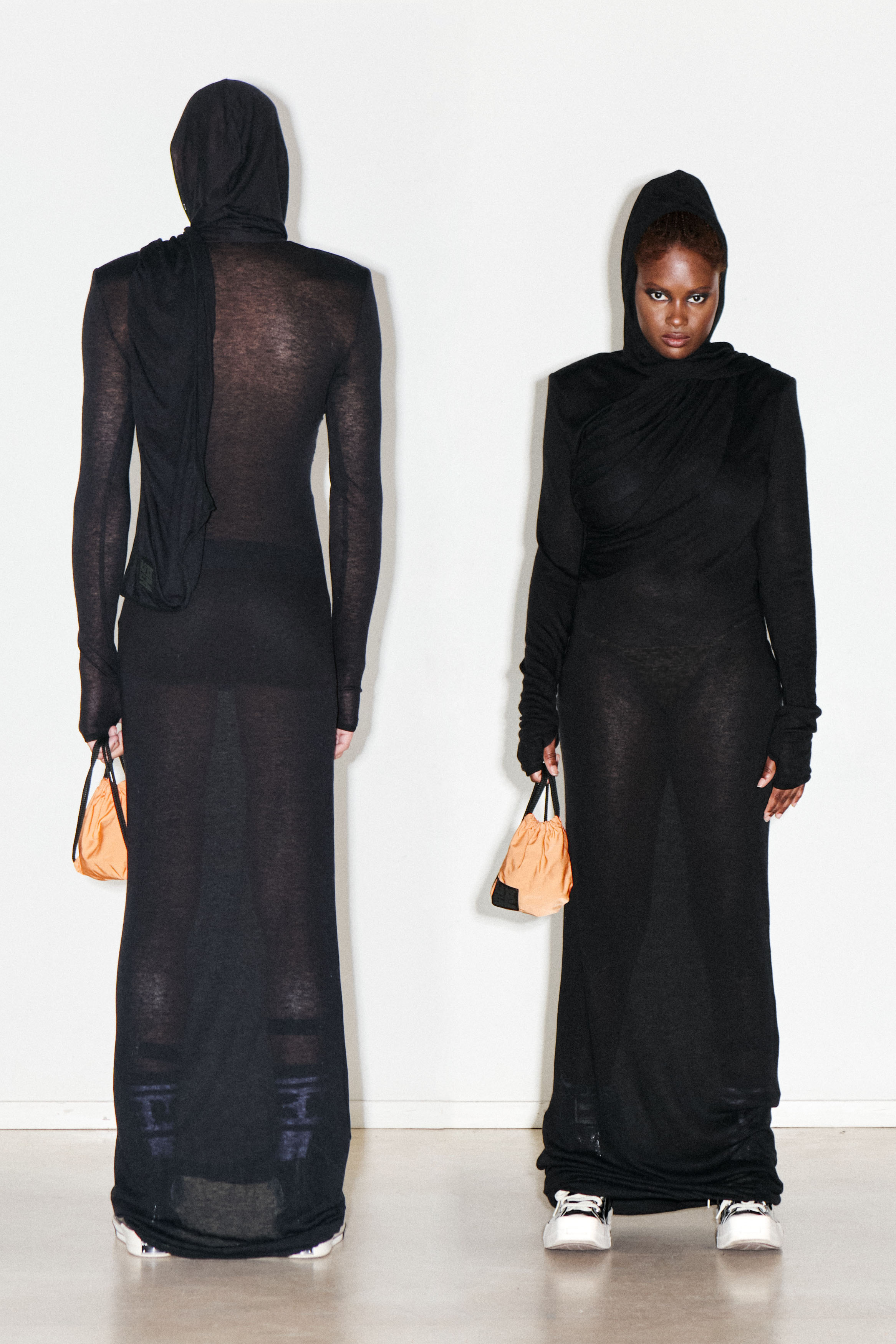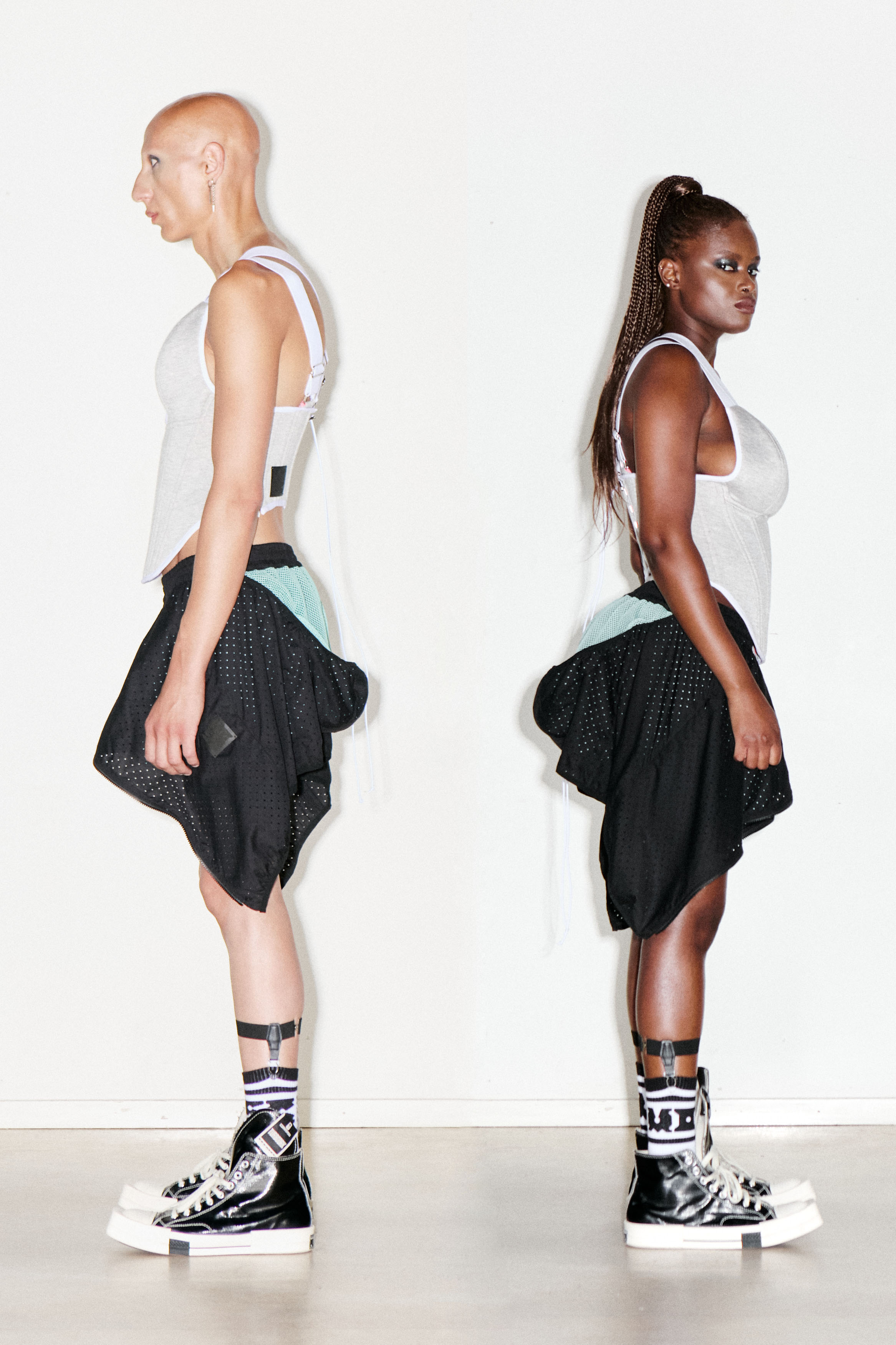 This garment is made in a perforated 100% cotton poplin & 100% polyamide mesh from deadstock. The garment is constructed to look like a jacket tied at hip. It has drawstrings in waist and zip at front.