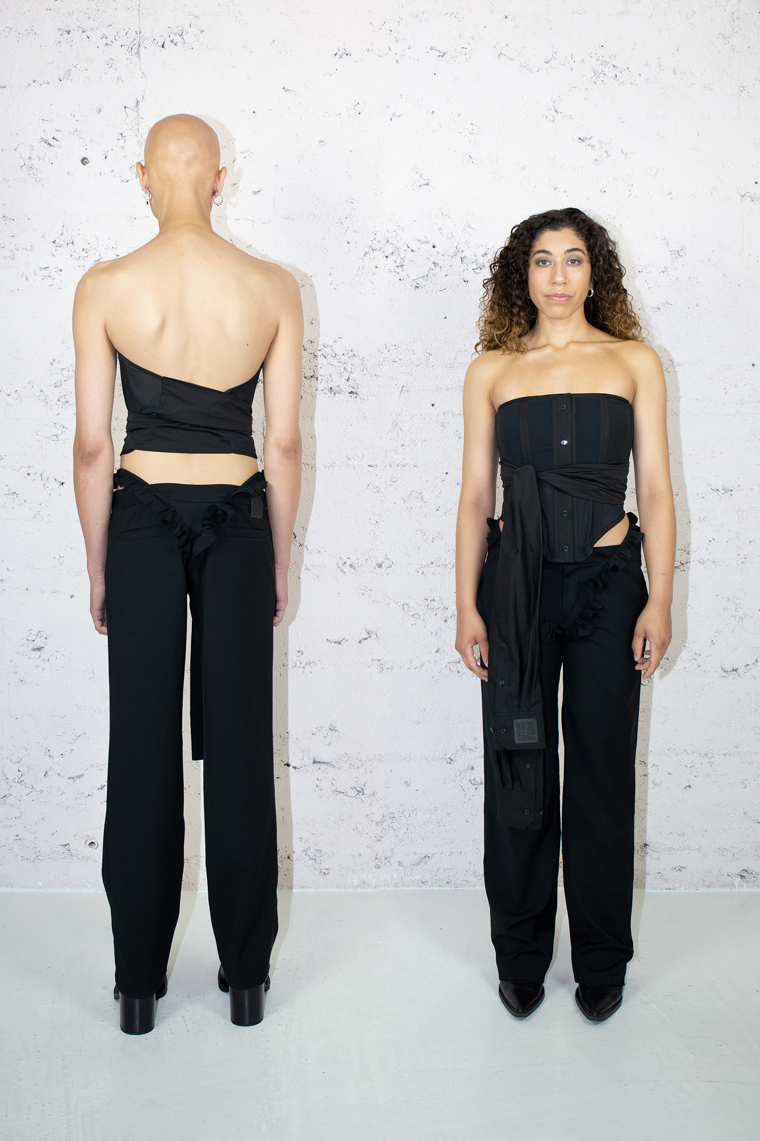 This garment has a tight fit and is made in 100% polyester from deadstock. The garment is adjustable due to fabric stretch and corset lacing at back. The garment has corset boning and adjustable shoulder straps.