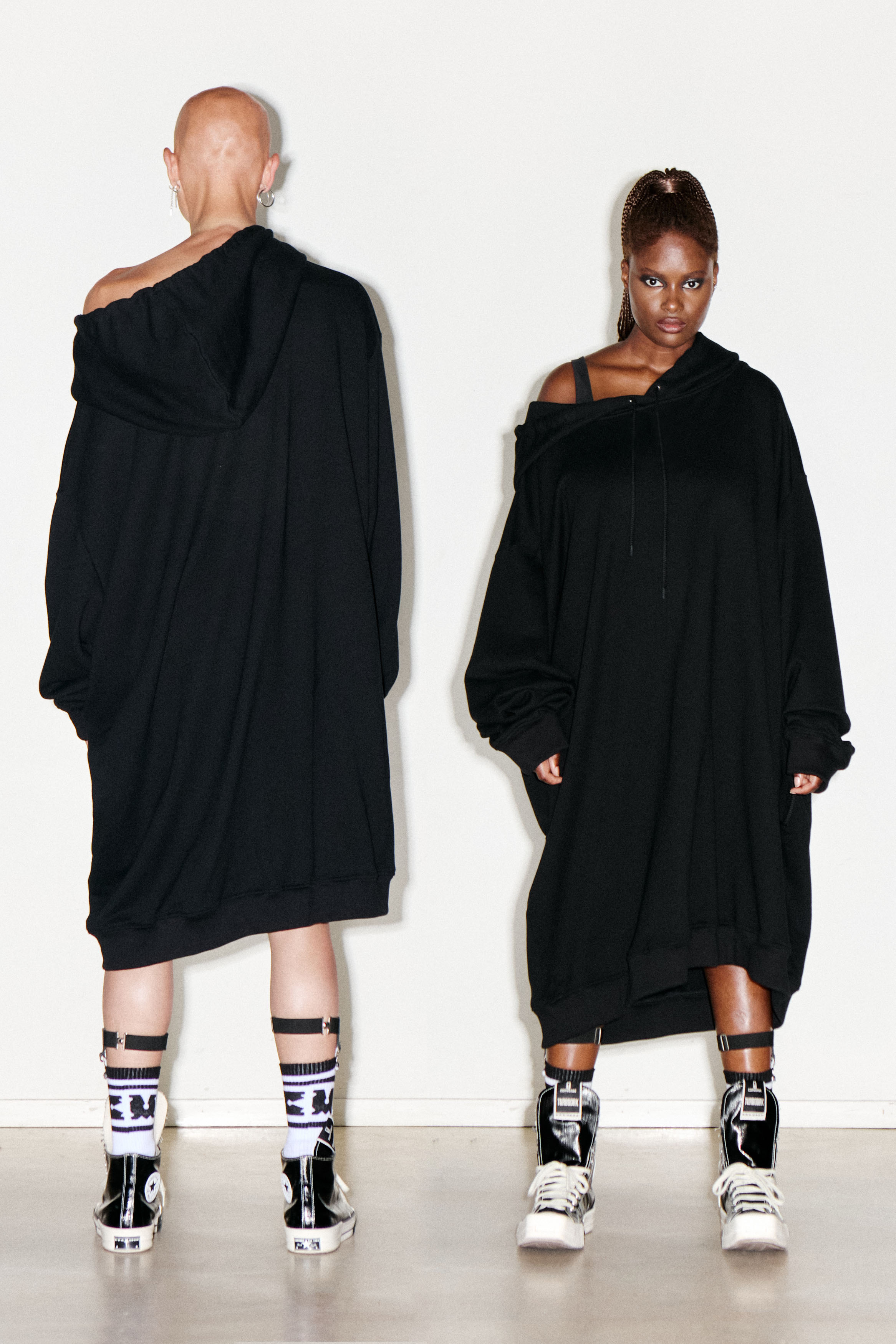 This garment has a semi tight fit and is made in 100% wool from deadstock. The fabric is light and semi transparent. It has a hooded scarf to throw over head and shouder. It features shoulder pads and thumb holes.