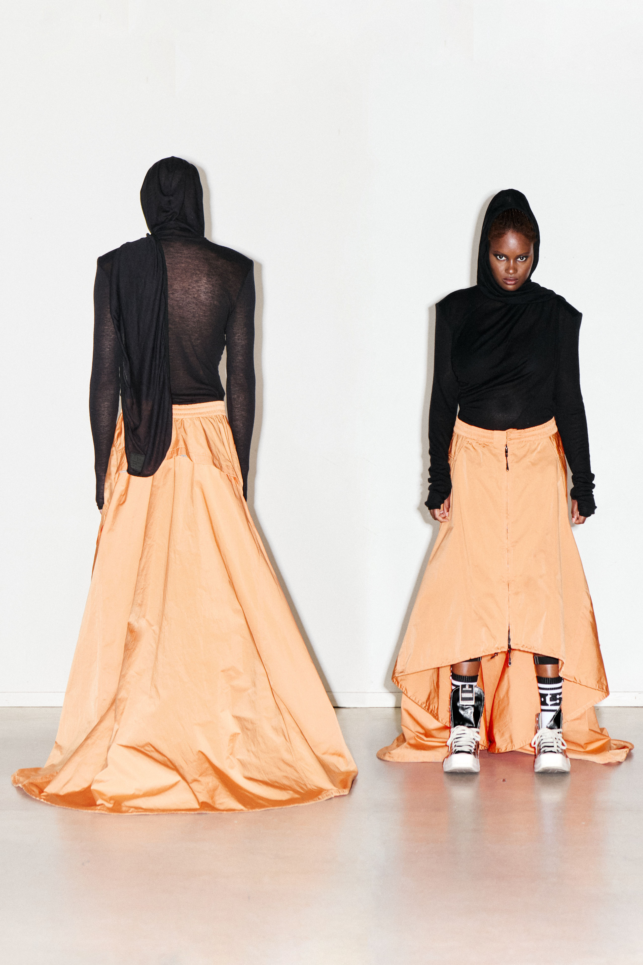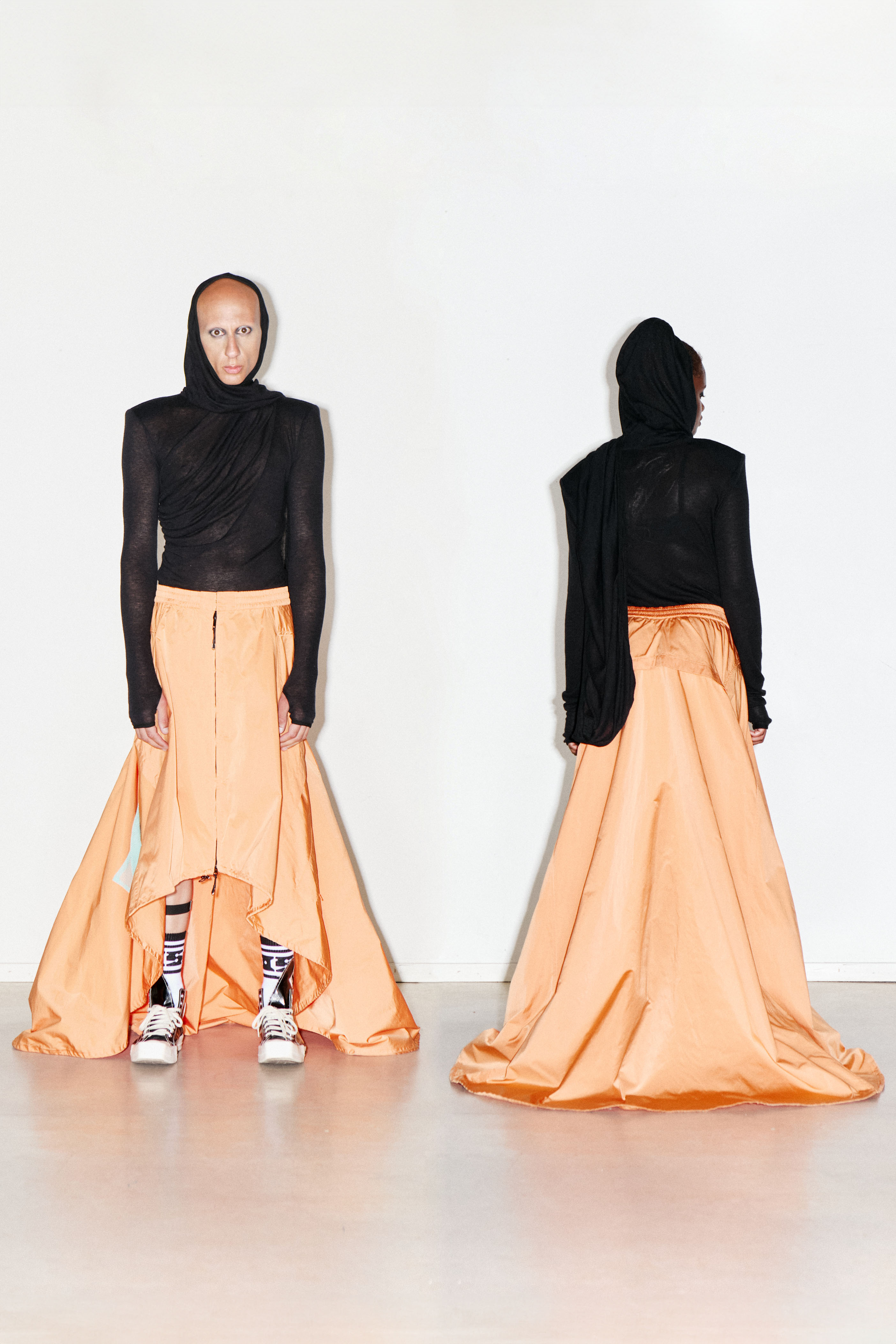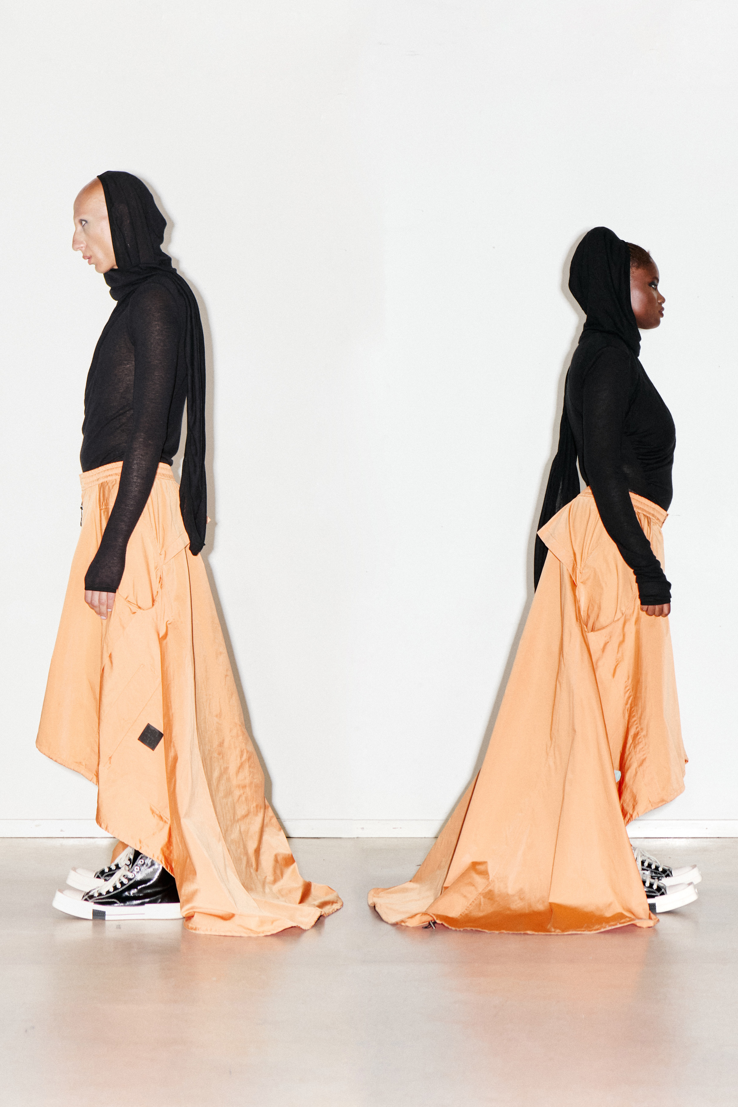 This garment has a semi tight fit and is made in 100% wool from deadstock. The fabric is light and semi transparent. It has a hooded scarf to throw over head and shouder. It features shoulder pads and thumb holes.