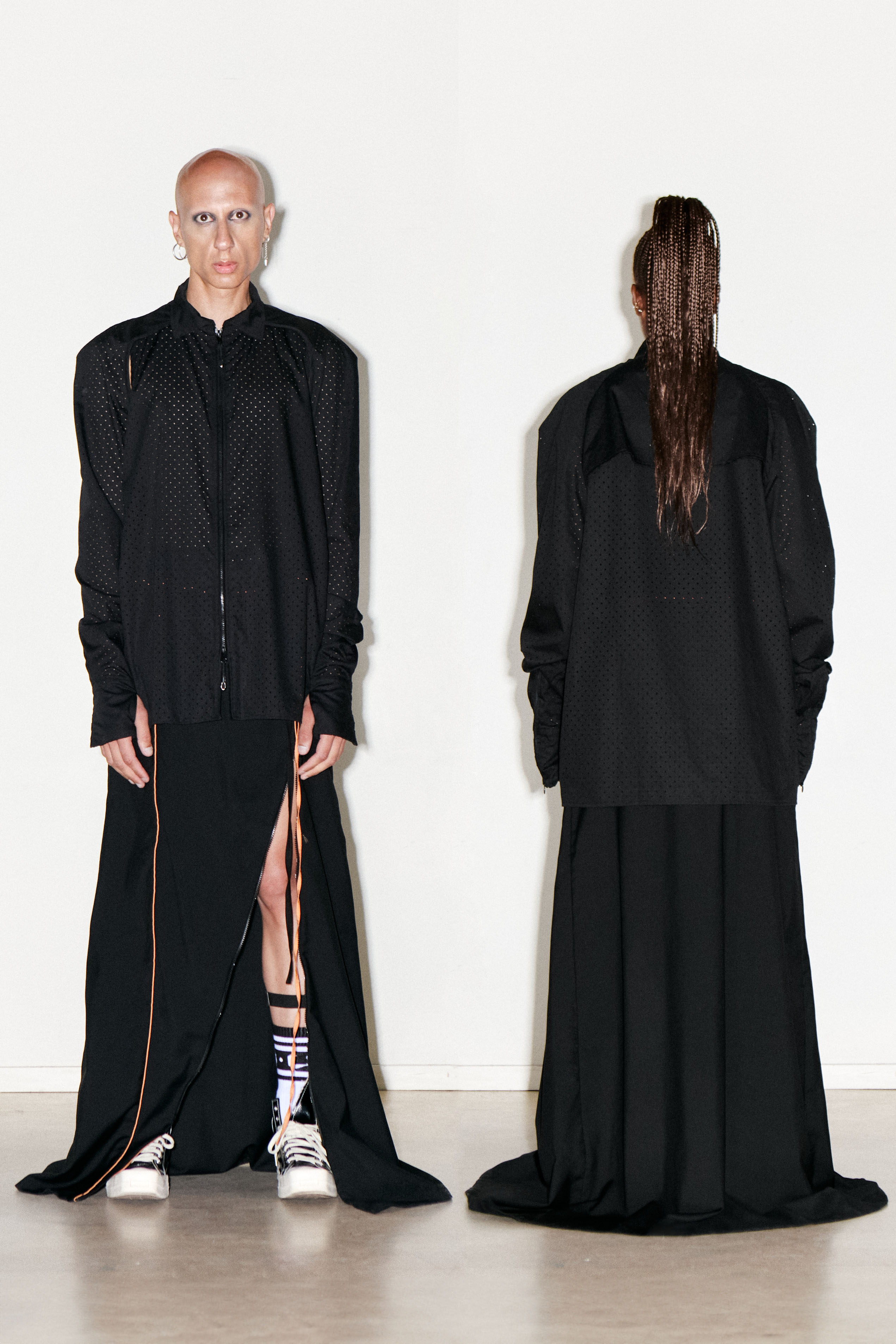Pouria is 189 cm and wearing a size M. Gabi is 168 cm and wearing a size M.