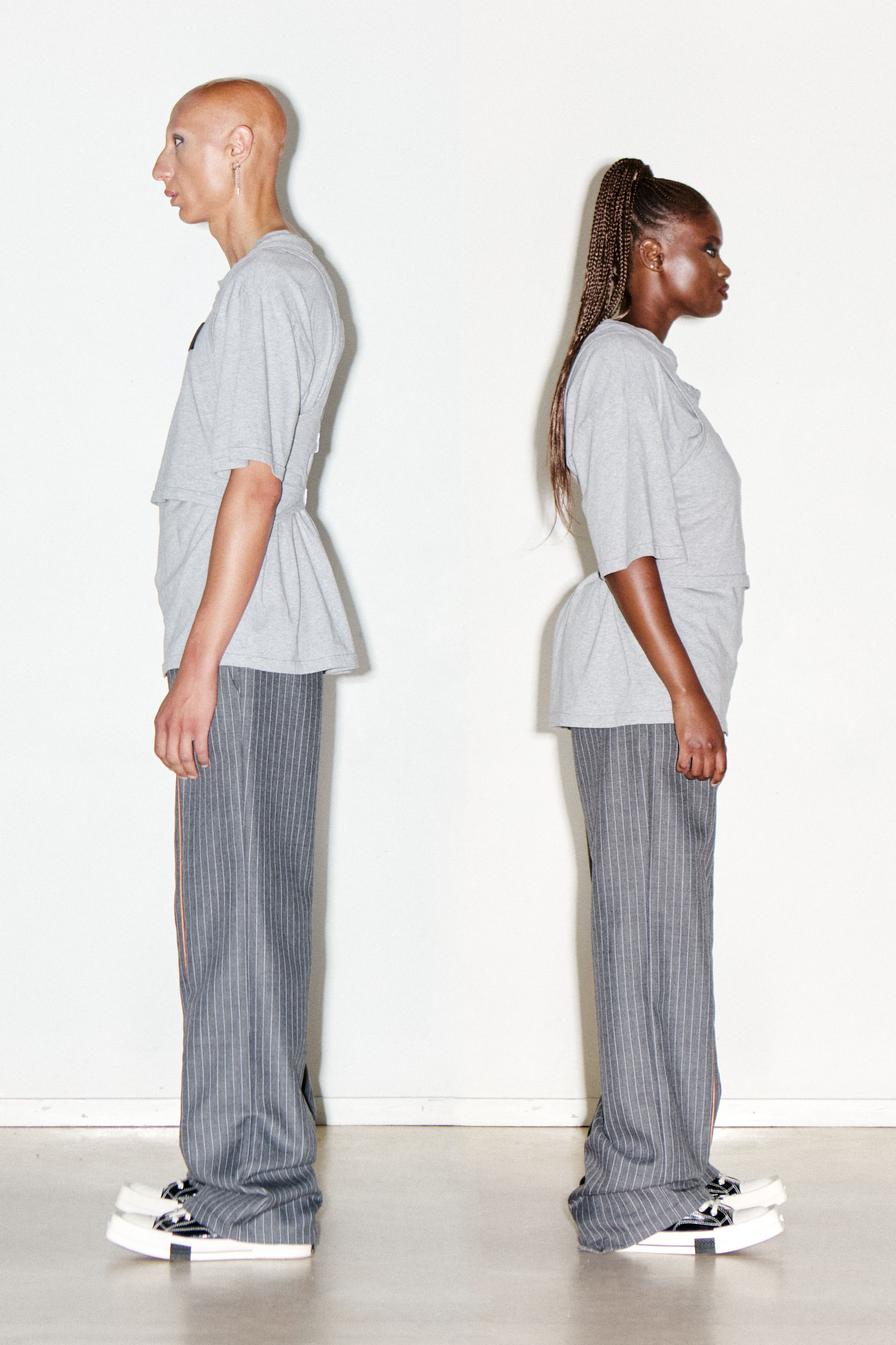 This garment has a loose fit and is made in 97% cotton & 3% elastane from deadstock. It’s adjustable due to hook and bars at back.