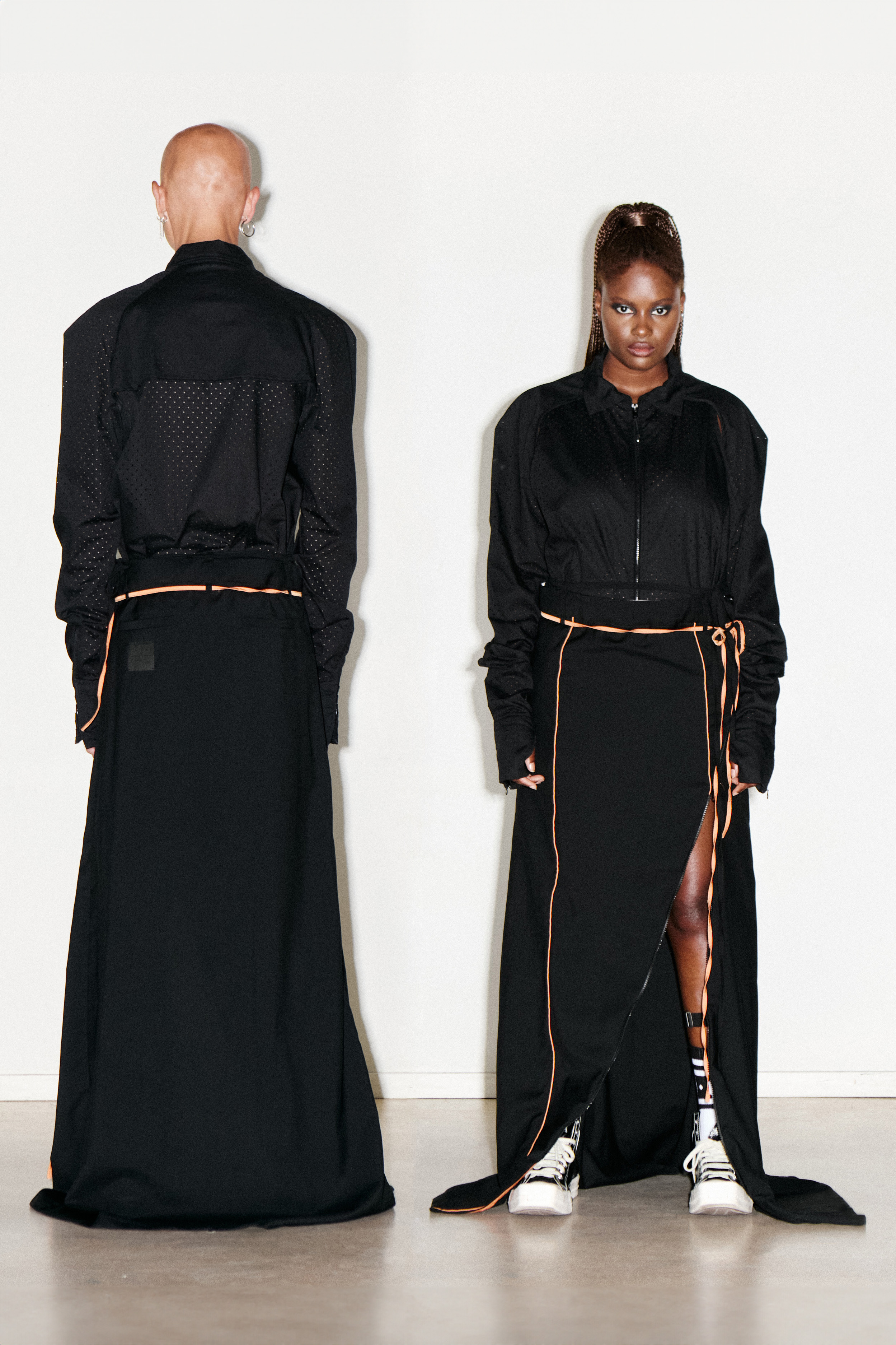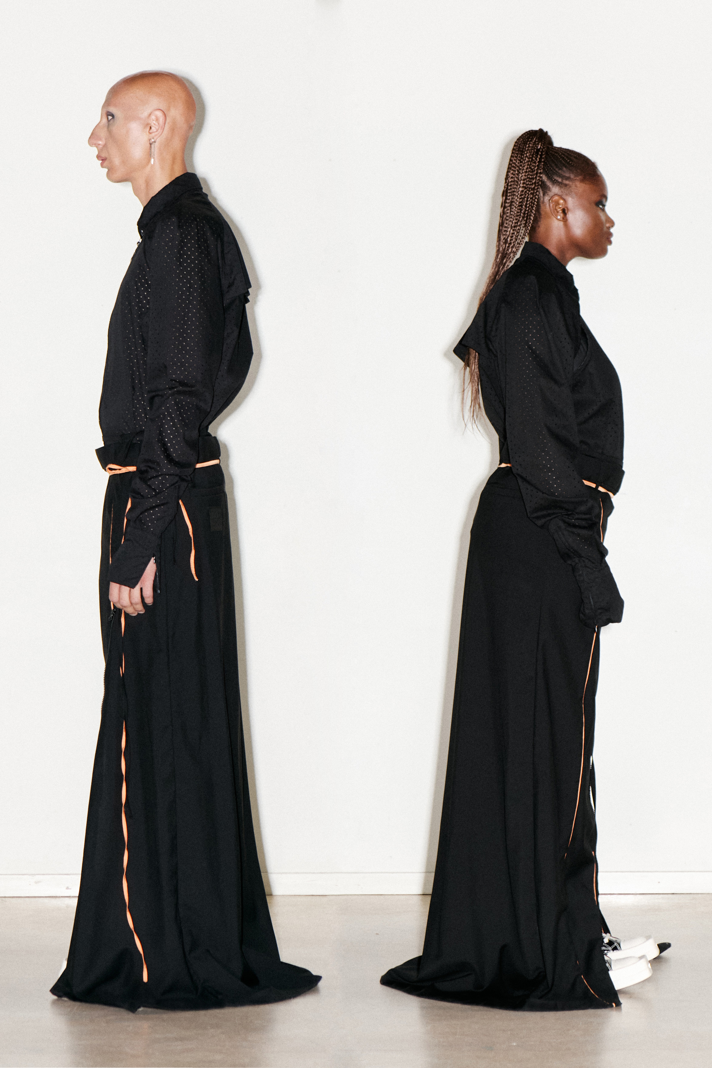 This garment is made in a cool and drapy 100% wool from deadstock. The garment has drawstrings in waist and a zip at front.