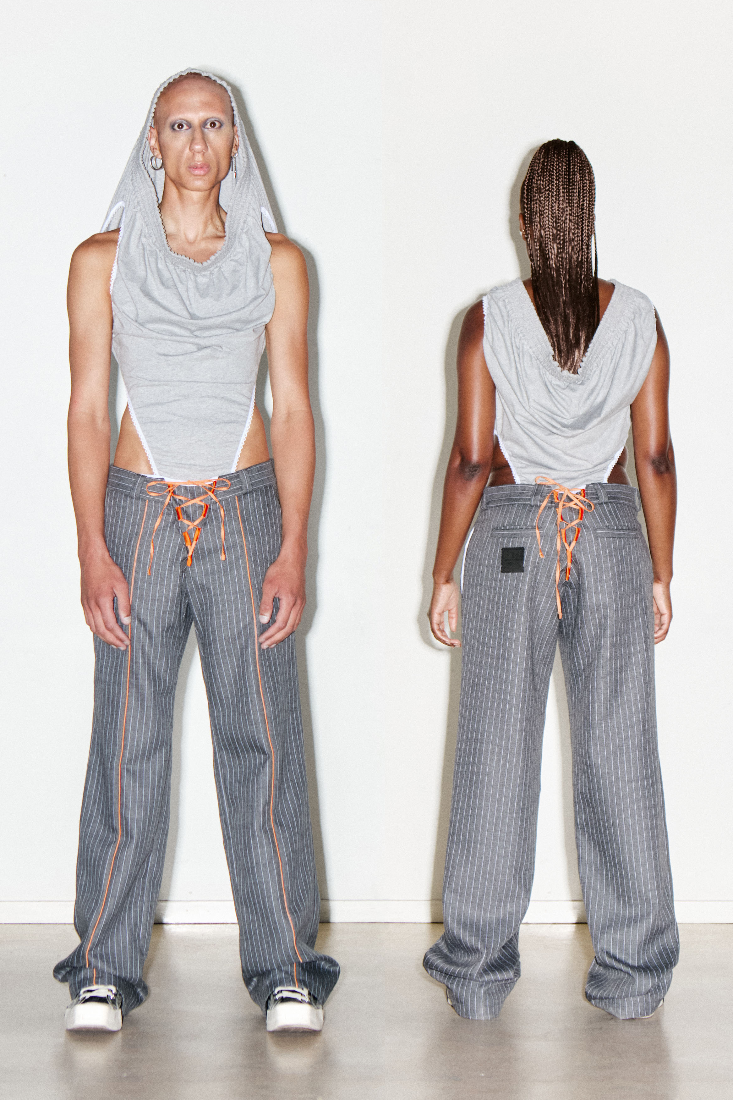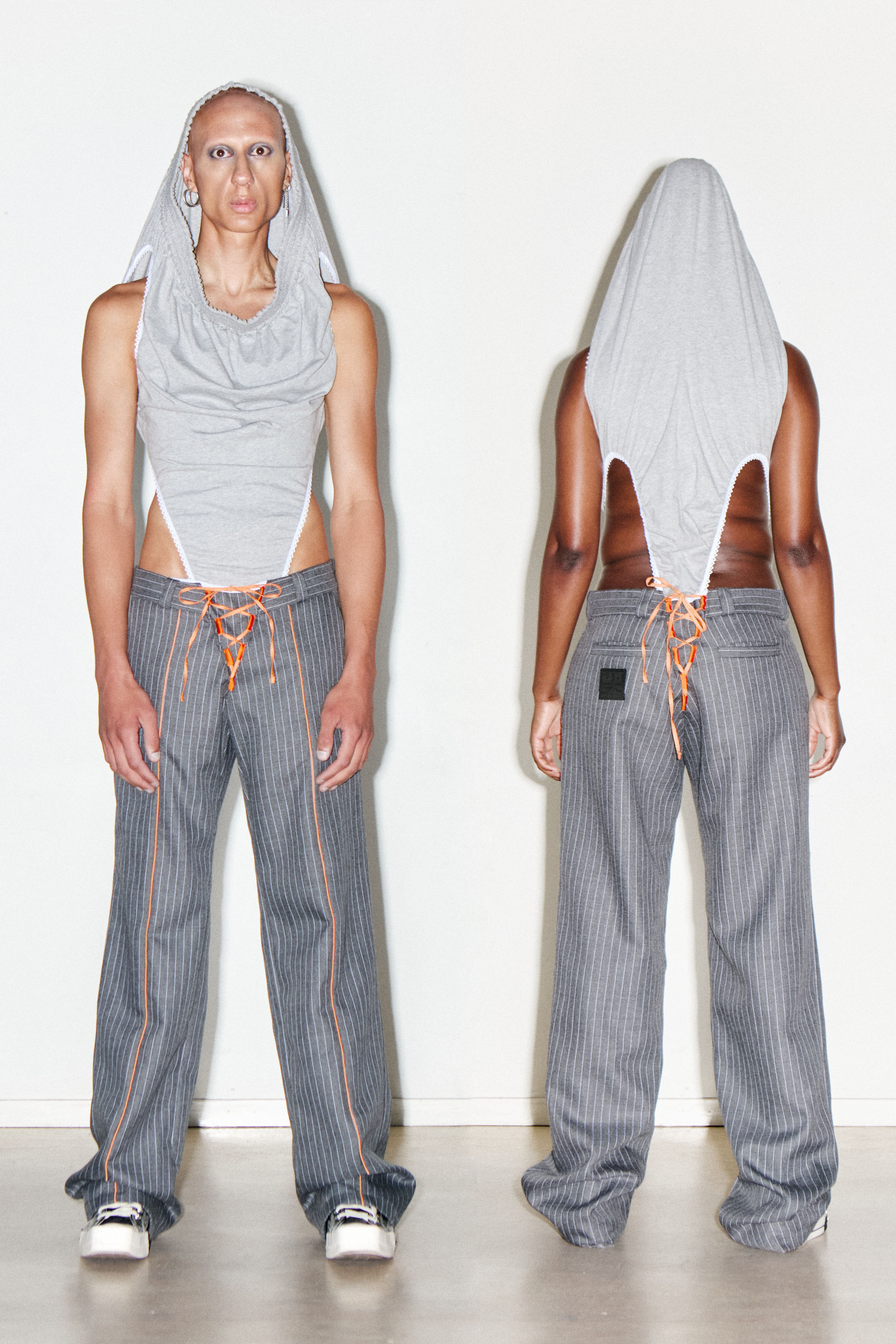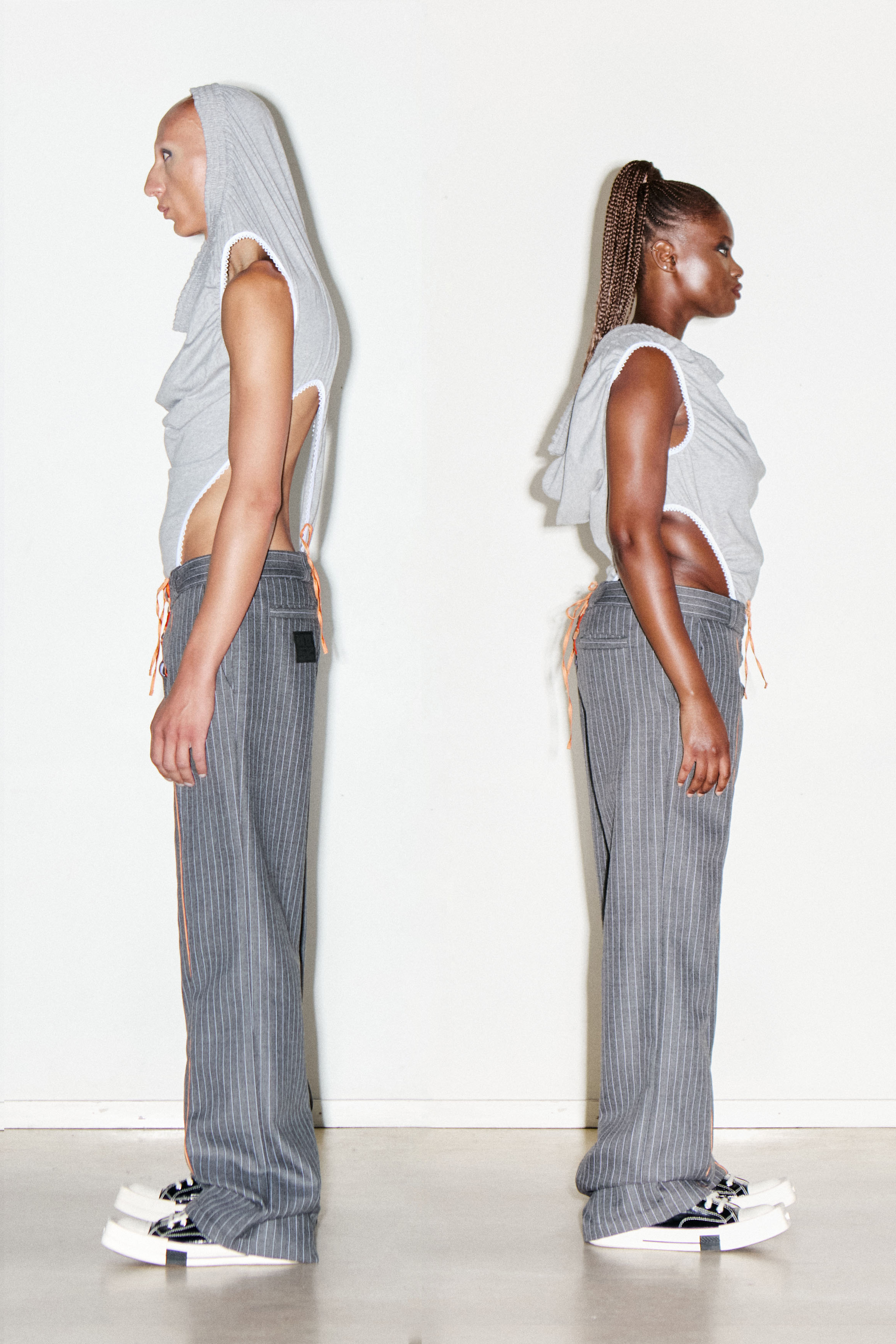 This garment has a semi tight fit and is made in 97% cotton & 3% elastane from deadstock. To be worn as cowl neck, off shoulder or as hood.